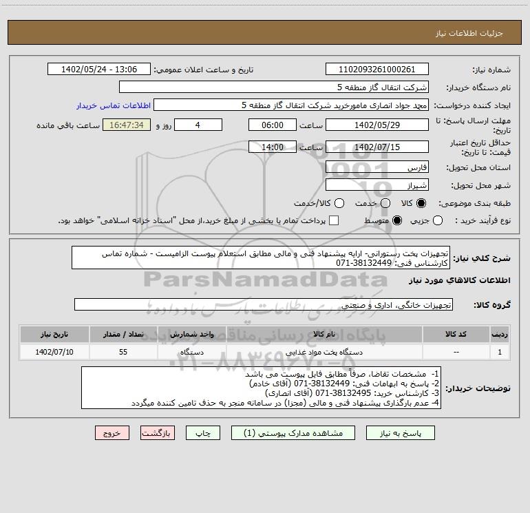 شرح کلی نیاز: تجهیزات پخت رستورانی- ارایه پیشنهاد فنی و مالی مطابق استعلام پیوست الزامیست - شماره تماس کارشناس فنی: 38132449-071