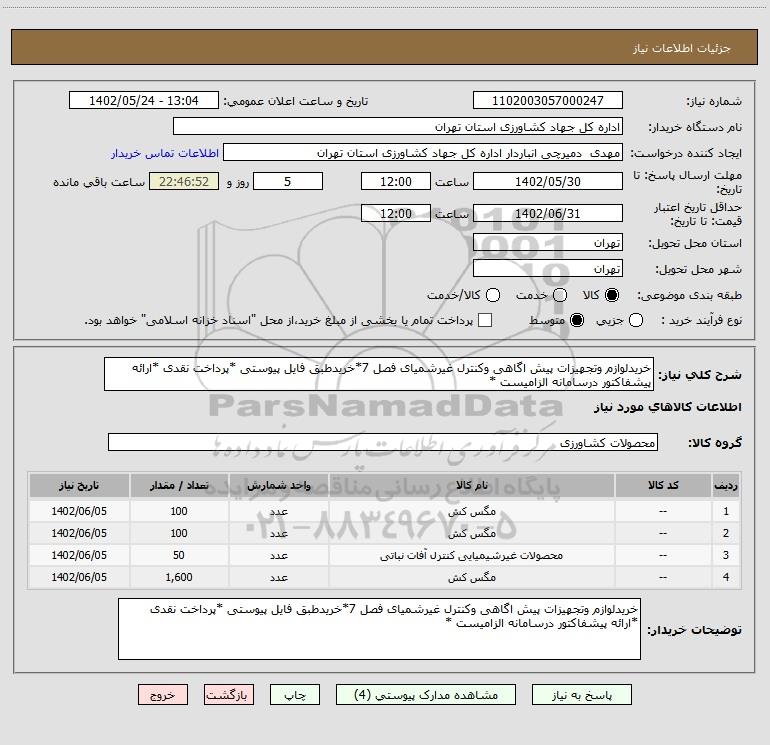 شرح کلی نیاز: خریدلوازم وتجهیزات پیش اگاهی وکنترل غیرشمیای فصل 7*خریدطبق فایل پیوستی *پرداخت نقدی *ارائه پیشفاکتور درسامانه الزامیست *