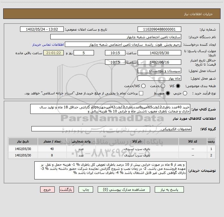 شرح کلی نیاز: خرید 40عدد باطری12ولت65آمپرو8عددباطری12ولت42آمپرجهتUpsو گارانتی حداقل 18 ماه و تولید سال جاری و ضمانت باطری معیوب تاشش ماه و خرابی 10 % هزینه ریالی و