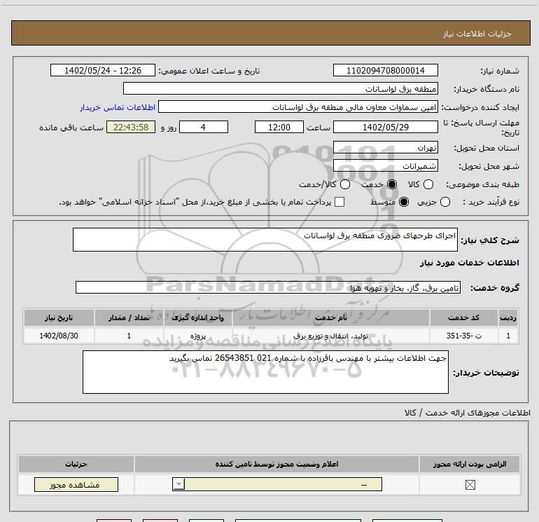 شرح کلی نیاز: اجرای طرحهای ضروری منطقه برق لواسانات