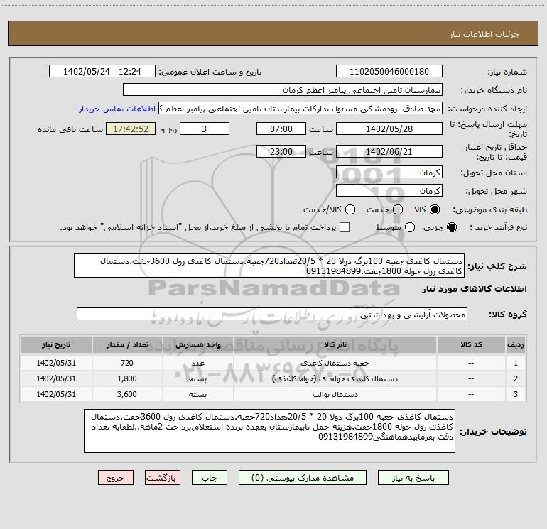 توضیحات خریدار:دستمال کاغذی جعبه 100برگ دولا 20 * 20/5تعداد720جعبه.دستمال کاغذی رول 3600جفت.دستمال کاغذی رول حوله 1800جفت.هزینه حمل تابیمارستان بعهده برنده استعلام.پرداخت 2ماهه..لطفابه تعداد دقت بفرماییدهماهنگی09131984899
