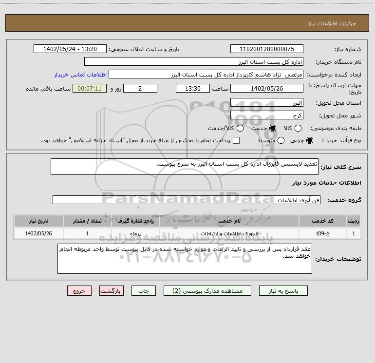 شرح کلی نیاز: تمدید لایسنس فایروال اداره کل پست استان البرز به شرح پیوست.