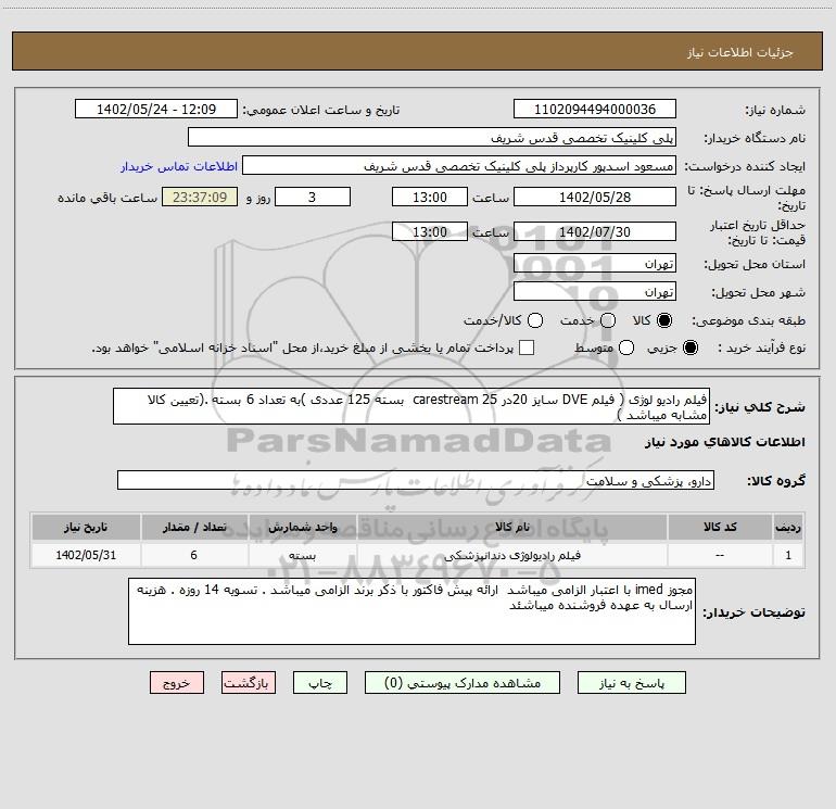 شرح کلی نیاز: فیلم رادیو لوژی ( فیلم DVE سایز 20در 25 carestream بسته 125 عددی )به تعداد 6 بسته .(تعیین کالا مشابه میباشد )
