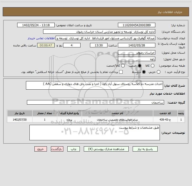 شرح کلی نیاز: احداث مدرسه دو کلاسه روستای سهل آباد زاوه ( اجرا و نصب پانل های دیواری و سقفی AAC )