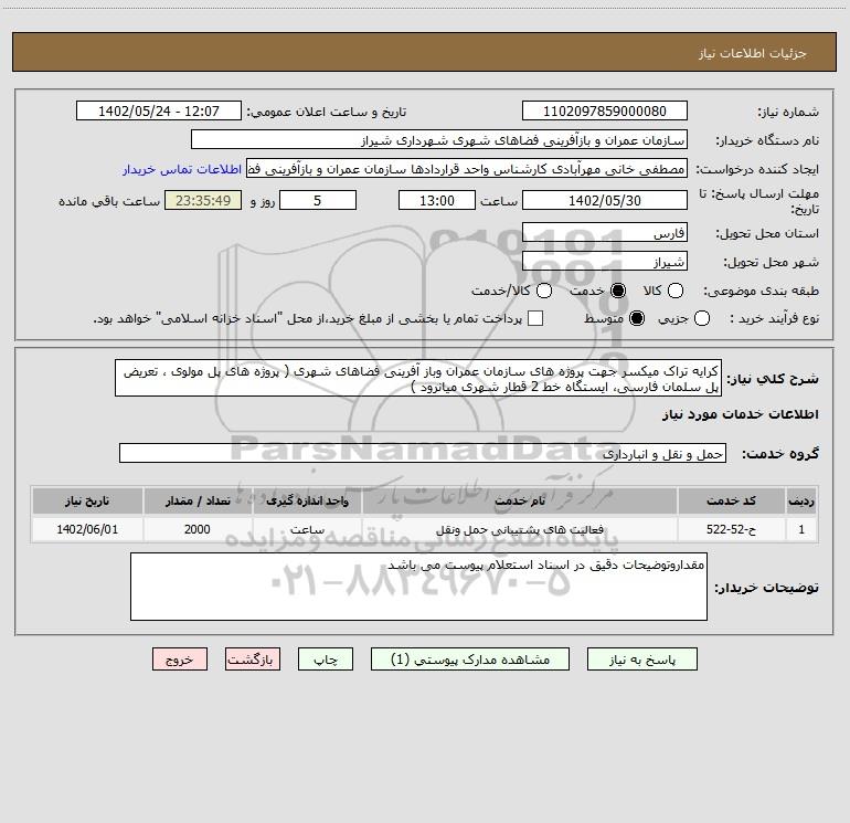 شرح کلی نیاز: کرایه تراک میکسر جهت پروژه های سازمان عمران وباز آفرینی فضاهای شهری ( پروژه های پل مولوی ، تعریض پل سلمان فارسی، ایستگاه خط 2 قطار شهری میانرود )