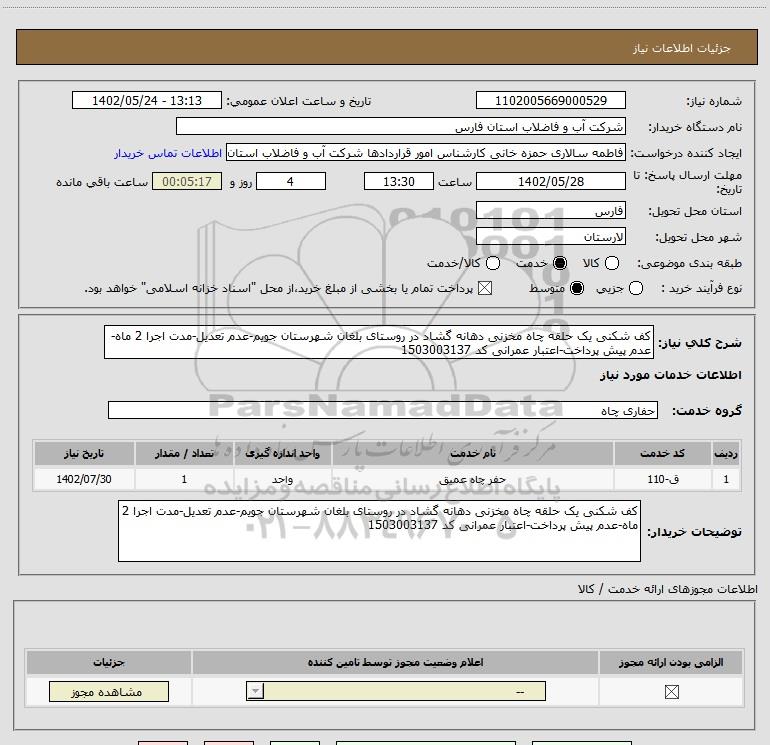 شرح کلی نیاز: کف شکنی یک حلقه چاه مخزنی دهانه گشاد در روستای بلغان شهرستان جویم-عدم تعدیل-مدت اجرا 2 ماه-عدم پیش پرداخت-اعتبار عمرانی کد 1503003137