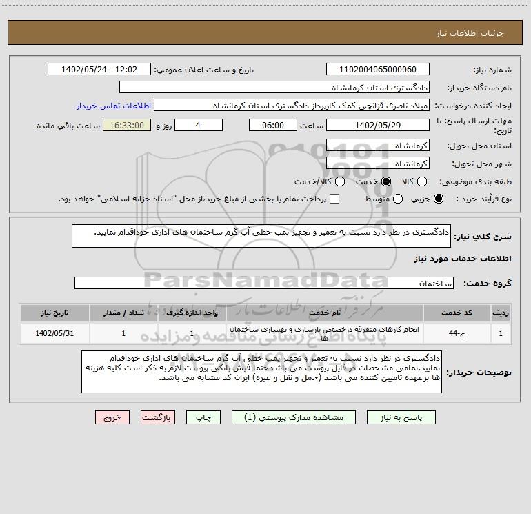شرح کلی نیاز: دادگستری در نظر دارد نسبت به تعمیر و تجهیز پمپ خطی آب گرم ساختمان های اداری خوداقدام نمایید.