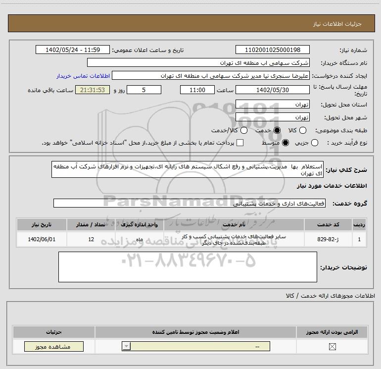 شرح کلی نیاز: استعلام بها مدیریت،پشتیانی و رفع اشکال سیستم های رایانه ای،تجهیزات و نرم افزارهای شرکت آب منطقه ای تهران