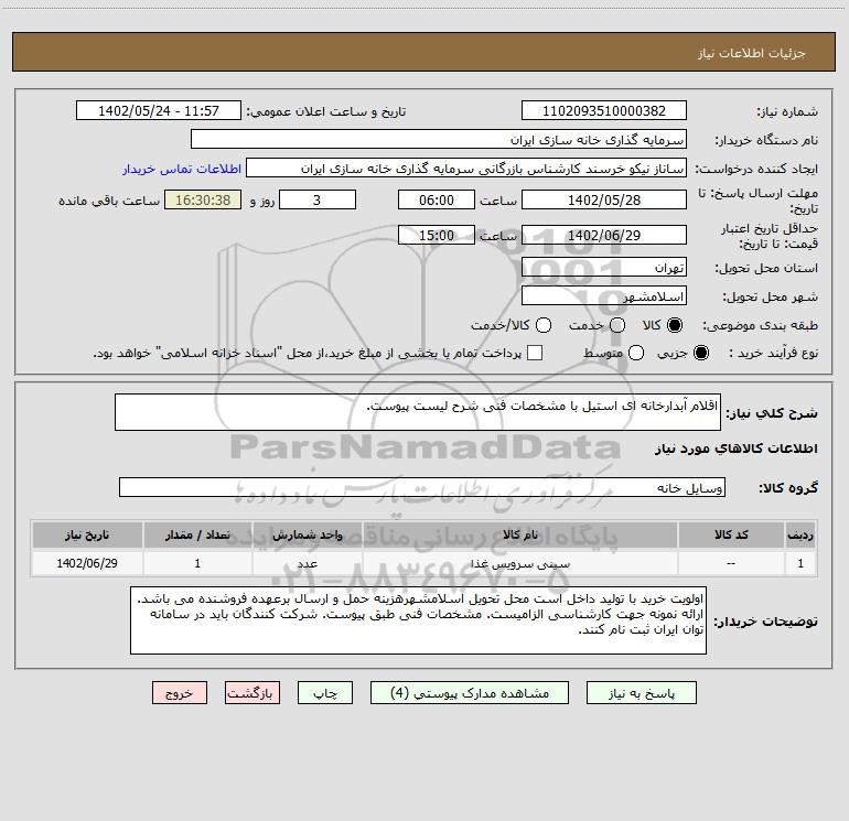 شرح کلی نیاز: اقلام آبدارخانه ای استیل با مشخصات فنی شرح لیست پیوست.