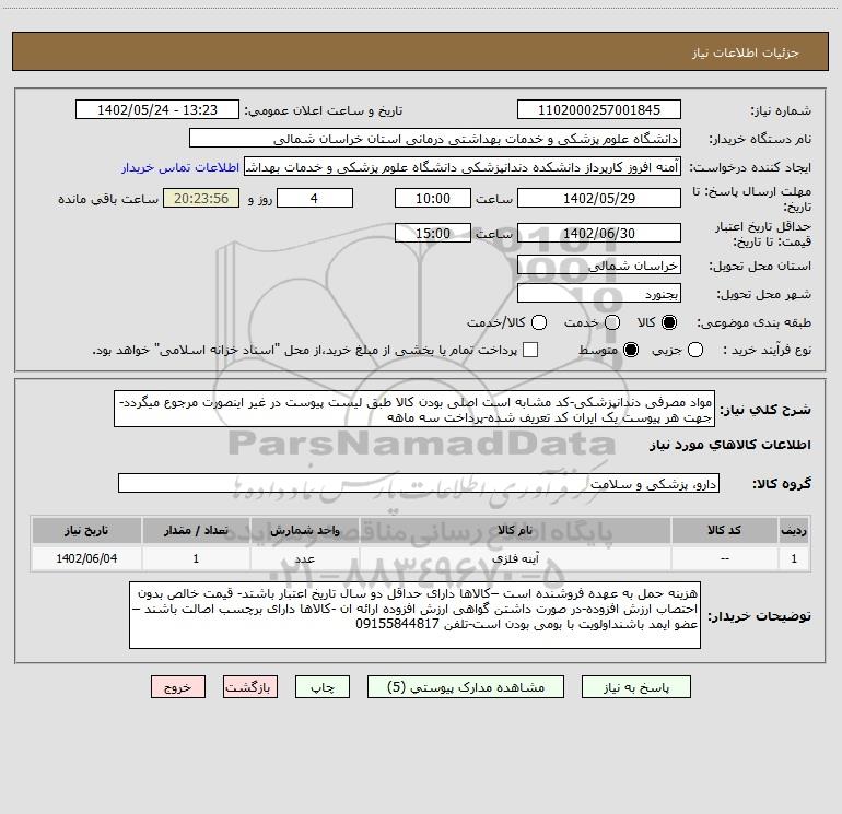 شرح کلی نیاز: مواد مصرفی دندانپزشکی-کد مشابه است اصلی بودن کالا طبق لیست پیوست در غیر اینصورت مرجوع میگردد-جهت هر پیوست یک ایران کد تعریف شده-پرداخت سه ماهه