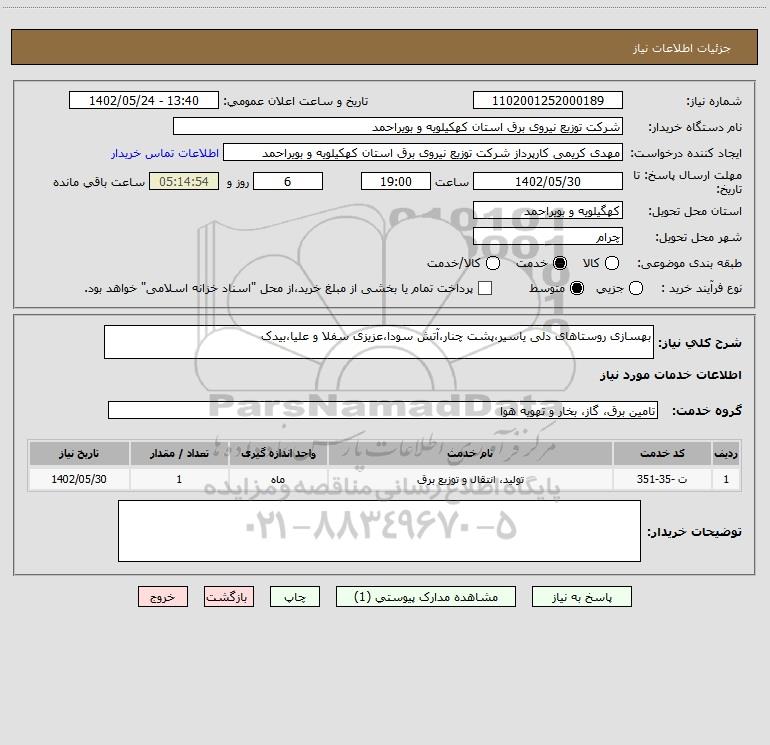 شرح کلی نیاز: بهسازی روستاهای دلی یاسیر،پشت چنار،آتش سودا،عزیزی سفلا و علیا،بیدک