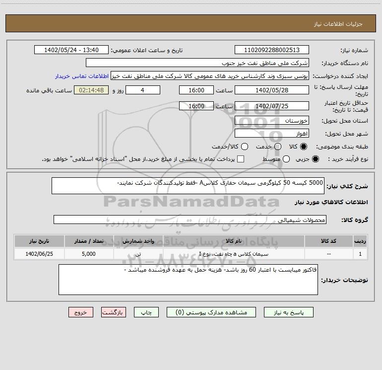 شرح کلی نیاز: 5000 کیسه 50 کیلوگرمی سیمان حفاری کلاسA -فقط تولیدکنندگان شرکت نمایند-