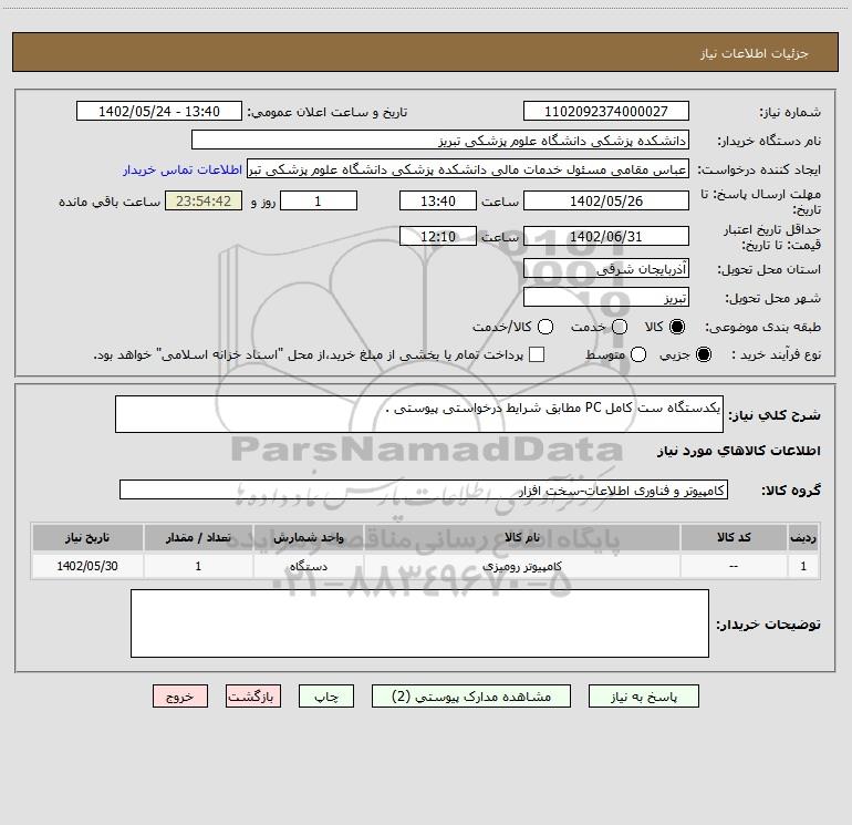 شرح کلی نیاز: یکدستگاه ست کامل PC مطابق شرایط درخواستی پیوستی .