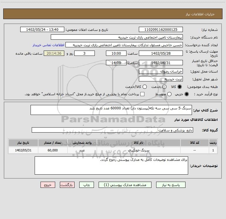 شرح کلی نیاز: سرنگ 5 سی سی سه تکه(پیستون دار) تعداد 60000 عدد تاریخ بلند