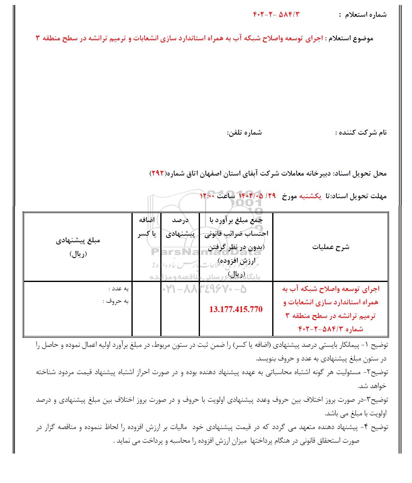 موضوع استعلام: اجرای توسعه و اصلاح شبکه آب به همراه استانداردسازی انشعابات و ترمیم ترانشه در سطح منطقه 3