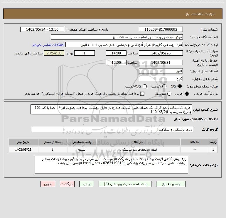 شرح کلی نیاز: خرید 1دستگاه رادیو گراف تک دندان طبق شرایط مندرج در فایل پیوست- پرداخت بصورت اوراق اخذا با کد 101 وتاریخ سررسید 1404/3/26