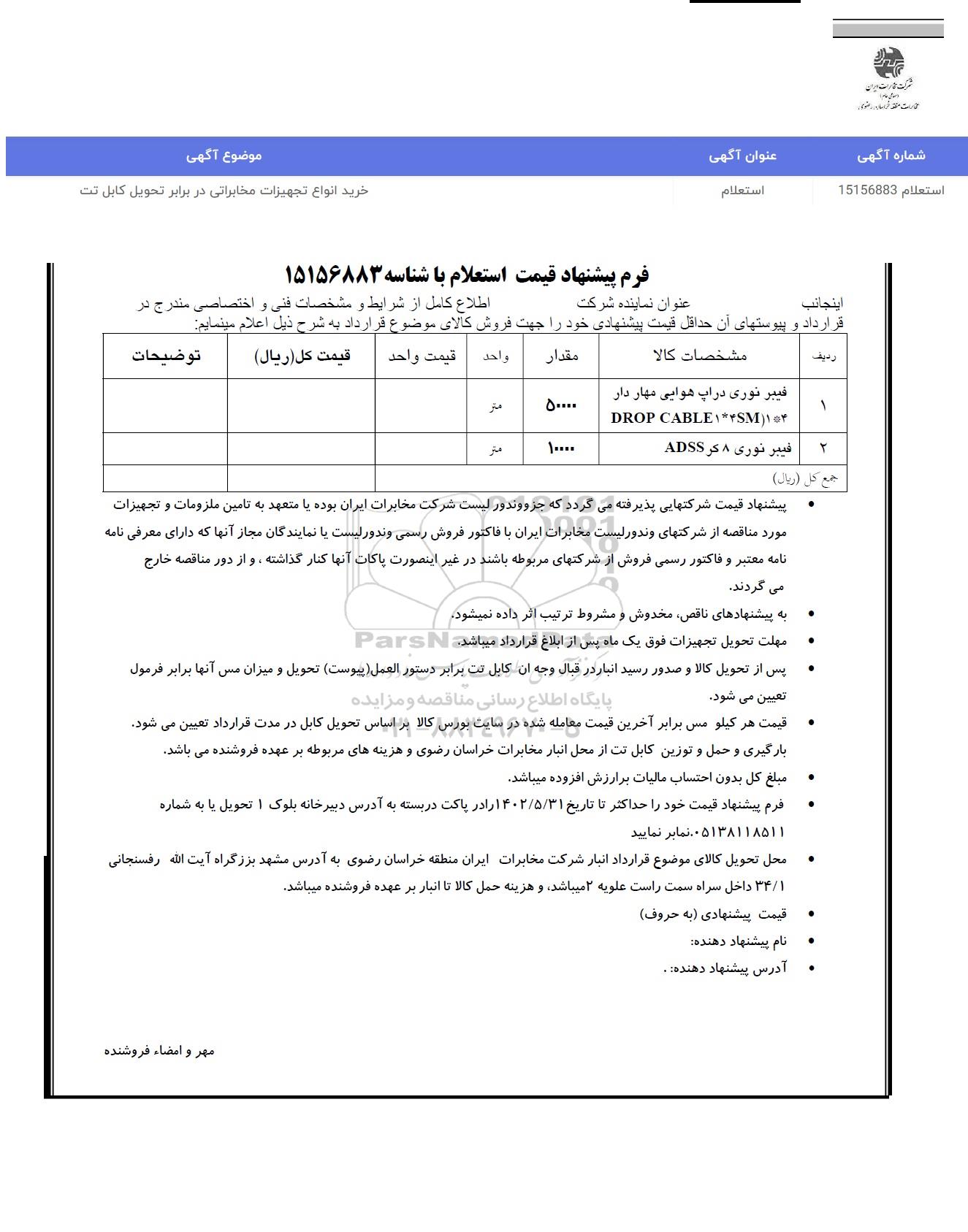 * قیمت هر کیلو مس برابر آخرین قیمت معامله شده در سایت بورس کالا بر اساس تحویل کابل در مدت قرارداد تعیین می شود. بارگیری و حمل و توزین کابل تت از محل انبار مخابرات خراسان رضوی و هزینه های مربوطه بر عهده فروشنده می باشد. مبلغ كل بدون احتساب مالیات بر ارزش افزوده میباشد.