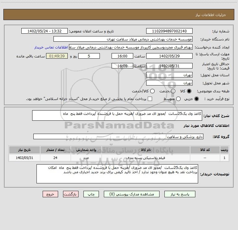 شرح کلی نیاز: کاغذ وی پک25سانت /مجوز ای مد ضروری /هزینه حمل با فروشنده /پرداخت فقط پنج ماه