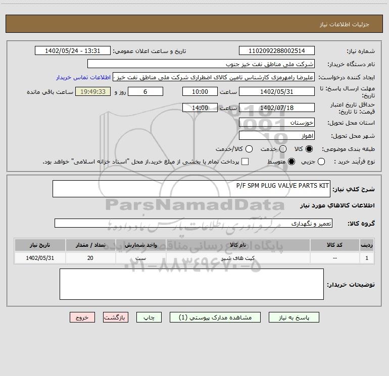 شرح کلی نیاز: P/F SPM PLUG VALVE PARTS KIT