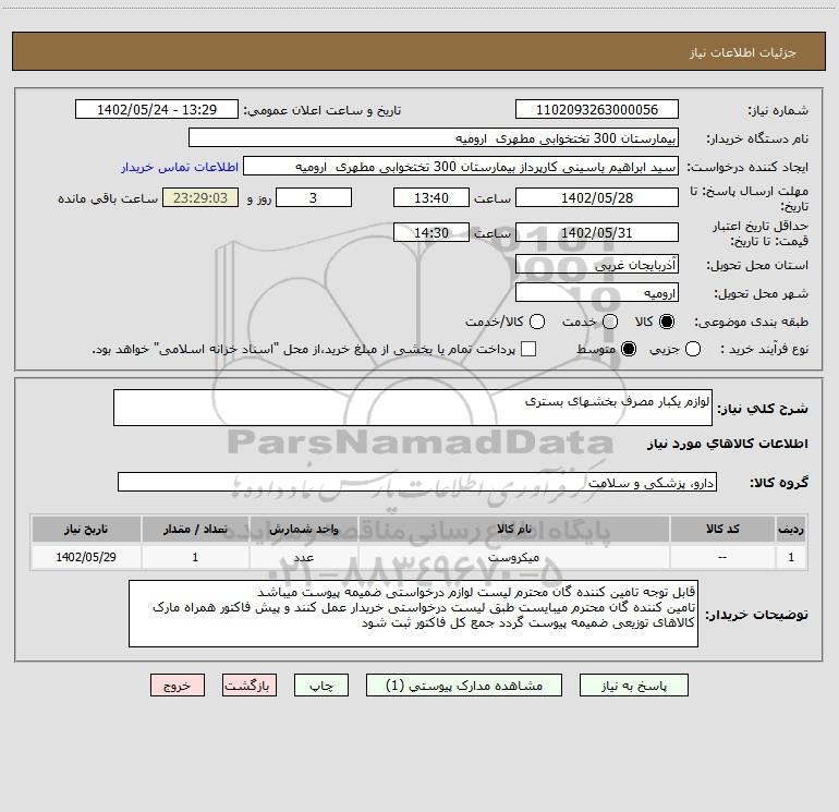 شرح کلی نیاز: لوازم یکبار مصرف بخشهای بستری