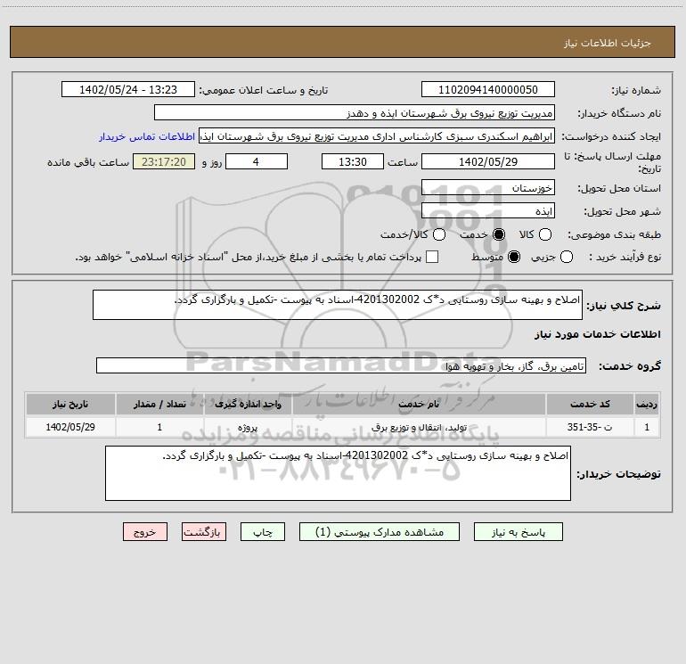 شرح کلی نیاز: اصلاح و بهینه سازی روستایی د*ک 4201302002-اسناد به پیوست -تکمیل و بارگزاری گردد.