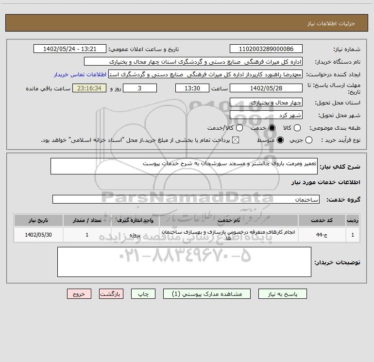 شرح کلی نیاز: تعمیر ومرمت باروی چالشتر و مسجد سورشجان به شرح خدمات پیوست