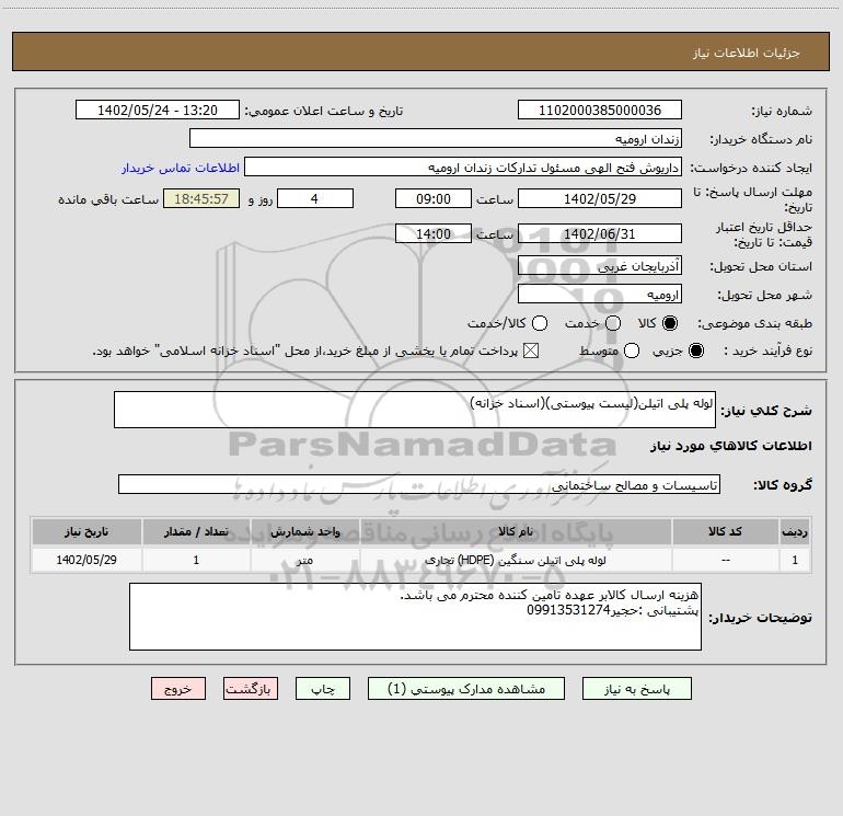 شرح کلی نیاز: لوله پلی اتیلن(لیست پیوستی)(اسناد خزانه)