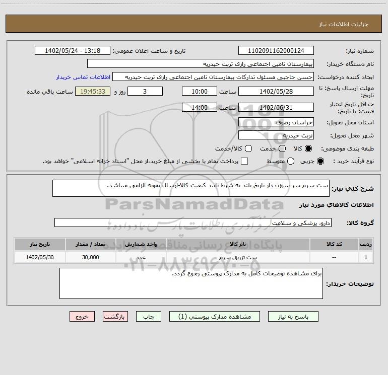 شرح کلی نیاز: ست سرم سر سوزن دار تاریخ بلند به شرط تایید کیفیت کالا-ارسال نمونه الزامی میباشد.