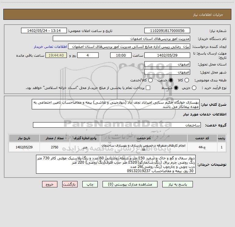 شرح کلی نیاز: بهسازی خوابگاه حکیم سنایی امیراباد نجف آباد (دیوارچینی و نقاشی) بیمه و مفاصاحساب تامین اجتماعی به عهده پیمانکار می باشد