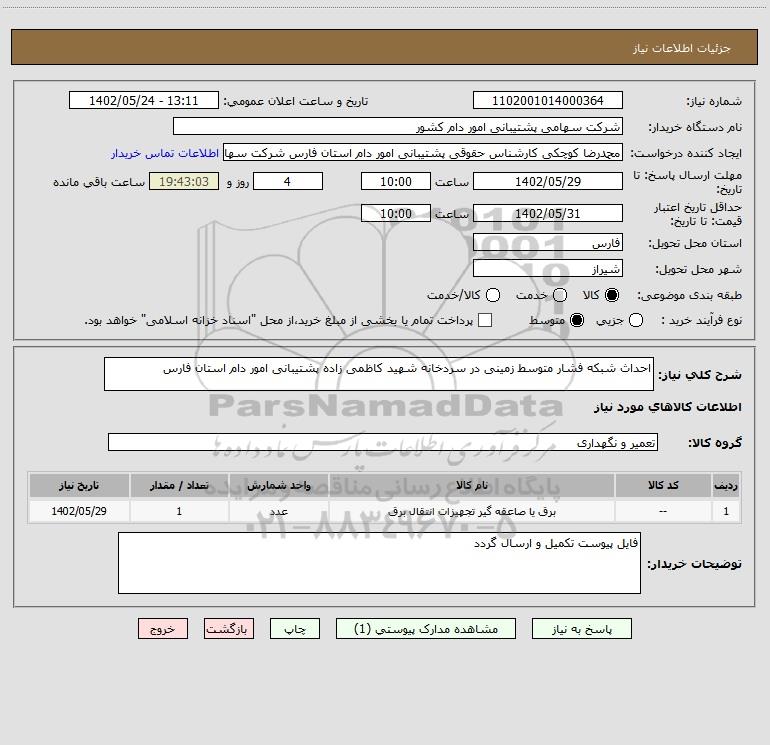 شرح کلی نیاز: احداث شبکه فشار متوسط زمینی در سردخانه شهید کاظمی زاده پشتیبانی امور دام استان فارس