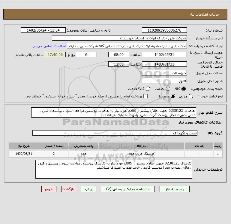 شرح کلی نیاز: تقاضای 0230125 جهت اطلاع بیشتر از کالای مورد نیاز به تقاضای پیوستی مراجعه شود ، پیشنهاد فنی ، مالی بصورت مجزا پیوست گردد ، خرید بصورت اعتباری میباشد.