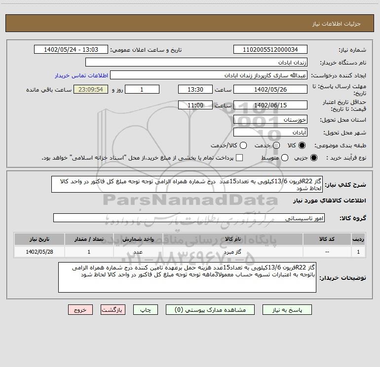 شرح کلی نیاز: گاز R22فریون 13/6کیلویی به تعداد15عدد درج شماره همراه الزامی توجه توجه مبلغ کل فاکتور در واحد کالا لحاظ شود