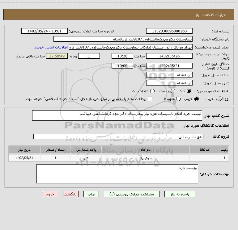 شرح کلی نیاز: لیست خرید اقلام تاسیسات مورد نیاز بیمارستان دکتر محمد کرمانشاهی میباشد
