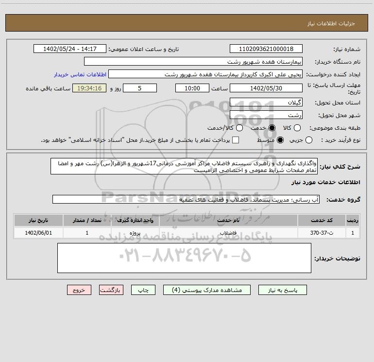 شرح کلی نیاز: واگذاری نگهداری و راهبری سیستم فاضلاب مراکز آموزشی درمانی17شهریور و الزهرا(س) رشت مهر و امضا تمام صفحات شرایط عمومی و اختصاصی الزامیست