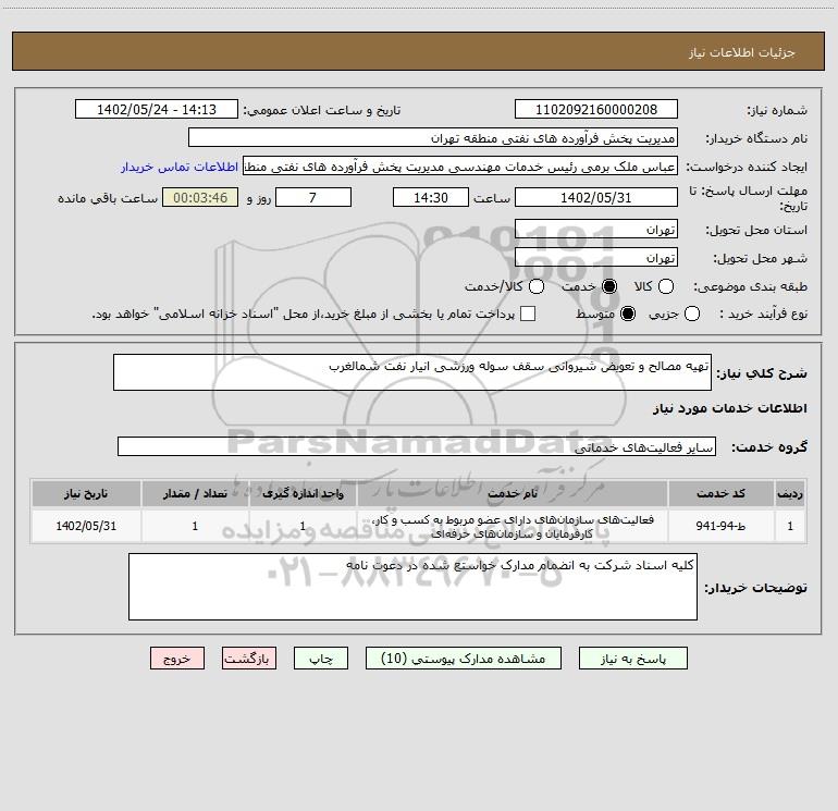 شرح کلی نیاز: تهیه مصالح و تعویض شیروانی سقف سوله ورزشی انیار نفت شمالغرب