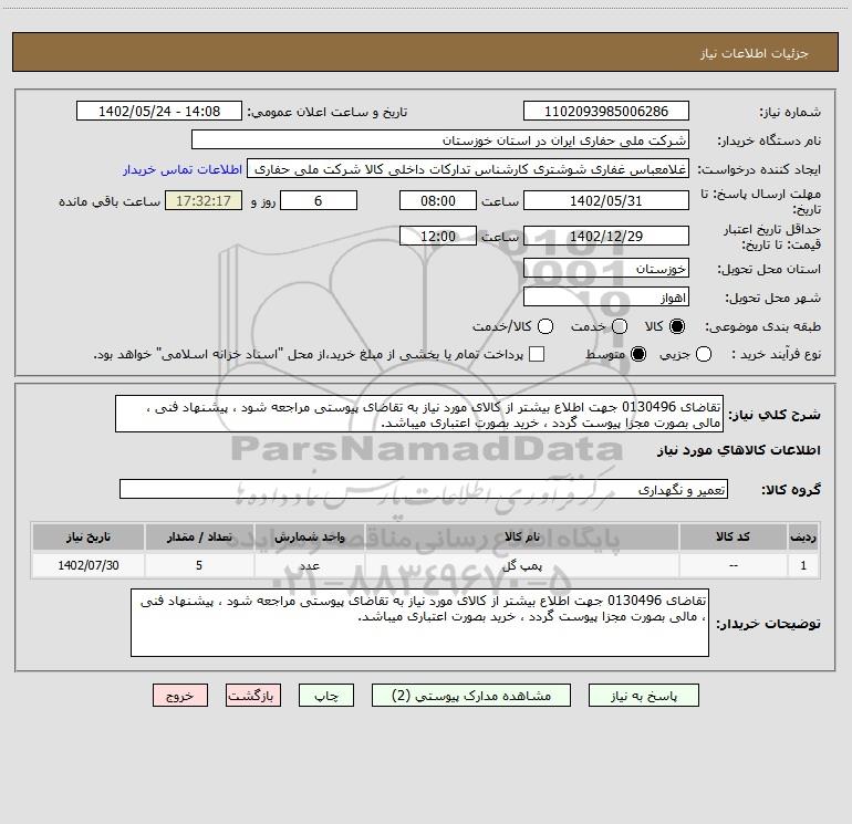 توضیحات خریدار:تقاضای 0130496 جهت اطلاع بیشتر از کالای مورد نیاز به تقاضای پیوستی مراجعه شود ، پیشنهاد فنی ، مالی بصورت مجزا پیوست گردد ، خرید بصورت اعتباری میباشد.