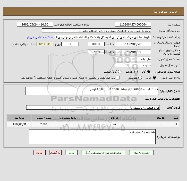 شرح کلی نیاز: قند شکسته 20000 کیلو معادل 2000 کیسه 10 کیلویی