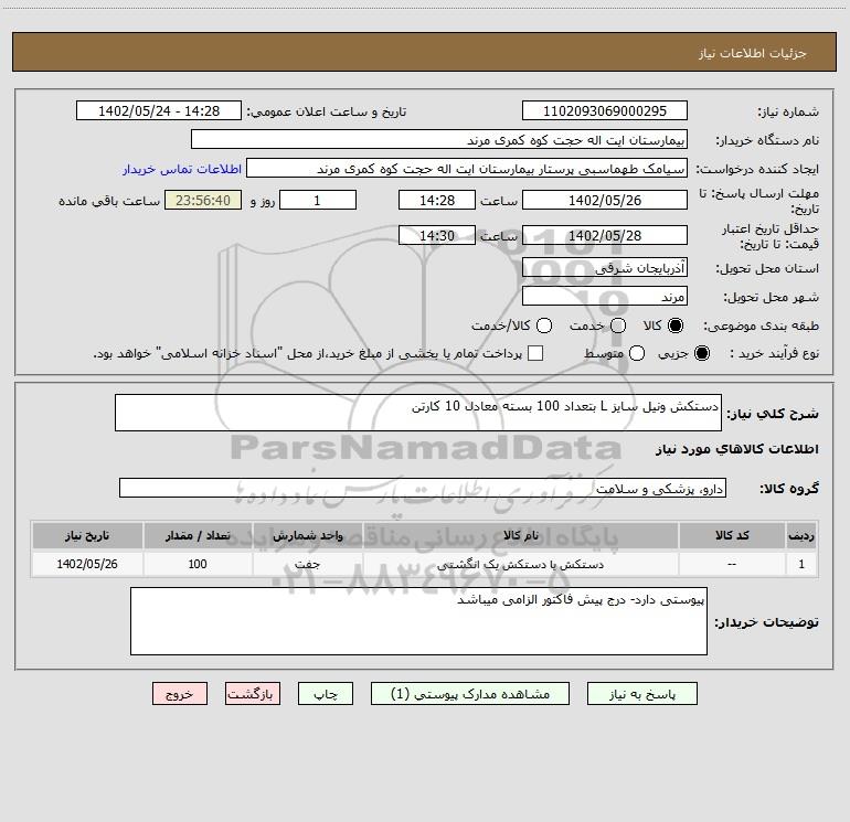 شرح کلی نیاز: دستکش ونیل سایز L بتعداد 100 بسته معادل 10 کارتن