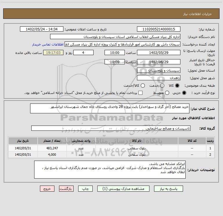 شرح کلی نیاز: خرید مصالح (آجر گری و سوراخدار) بابت پروژه 28 واحدی روستای چاه جمال شهرستان ایرانشهر