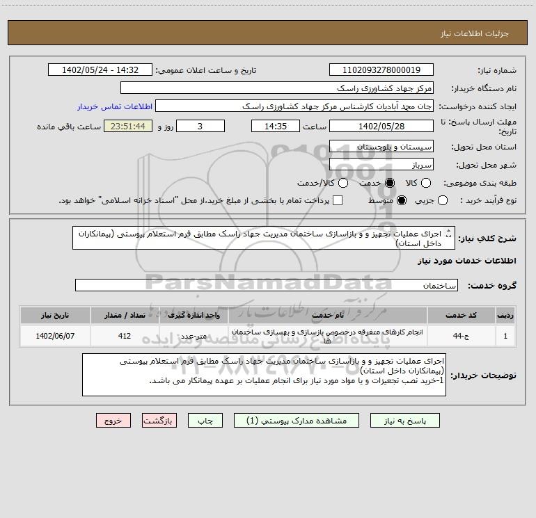 شرح کلی نیاز: اجرای عملیات تجهیز و و بازاسازی ساختمان مدیریت جهاد راسک مطابق فرم استعلام پیوستی (پیمانکاران داخل استان)
