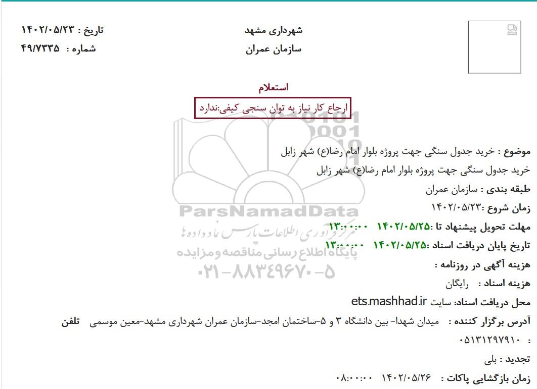 موضوع : خرید جدول سنگی جهت پروژه بلوار امام رضا(ع) شهر زابل