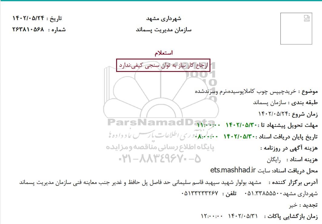 استعلام خرید چیپس چوب کاملا پوسیده، نرم و سرندشده, استعلام خرید چیپس چوب کاملا پوسیده، نرم و سرندشده