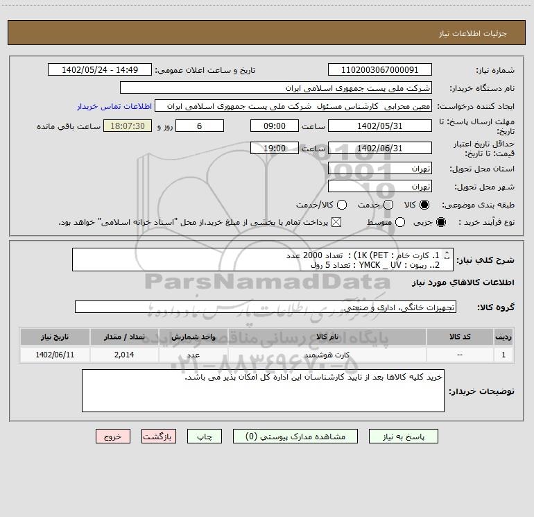 استعلام 1. کارت خام : 1K (PET) : تعداد 2000 عدد 2.. ریبون : YMCK _ UV : تعداد 5 رول 3.فیلم مخصوص : 9 رول, استعلام 1. کارت خام : 1K (PET) : تعداد 2000 عدد 2.. ریبون : YMCK _ UV : تعداد 5 رول 3.فیلم مخصوص : 9 رول
