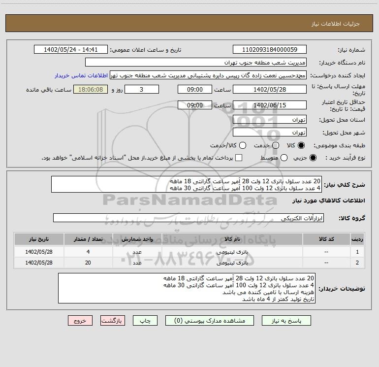 | 2 | -- | باتری لیتیومی | عدد | 20 | 1402/05/28 |