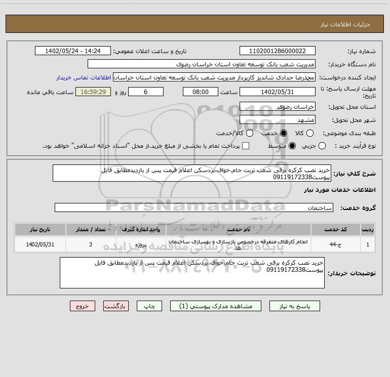 شرح کلی نیاز: خرید نصب کرکره برقی شعب تربت جام،خواف،بردسکن اعلام قیمت پس از بازدیدمطابق فایل پیوست09119172338