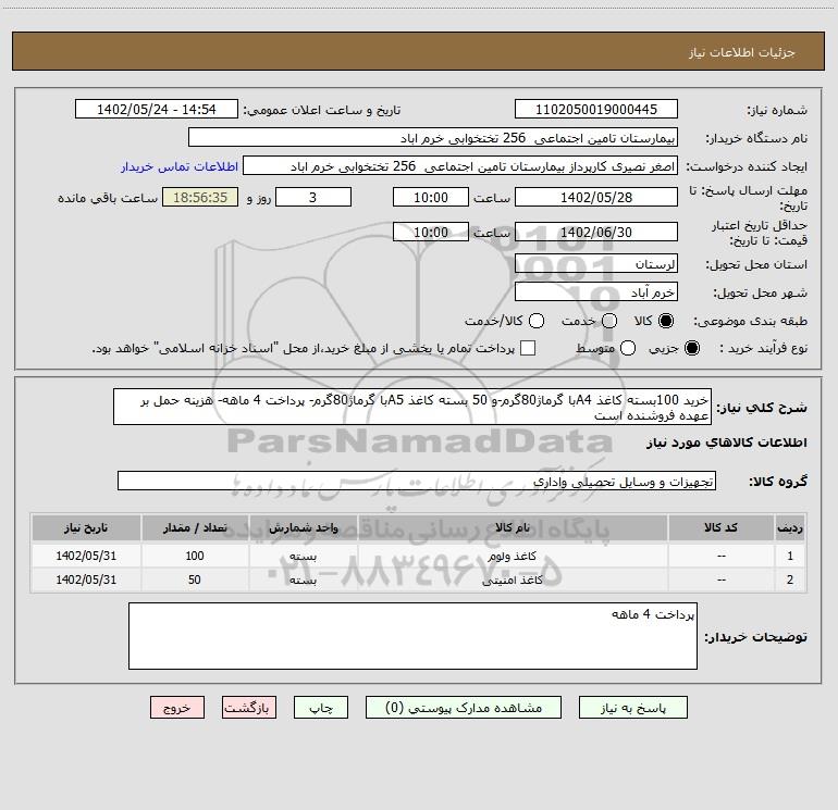 شرح کلی نیاز: خرید 100بسته کاغذ A4با گرماژ80گرم-و 50 بسته کاغذ A5با گرماژ80گرم- پرداخت 4 ماهه- هزینه حمل بر عهده فروشنده است
