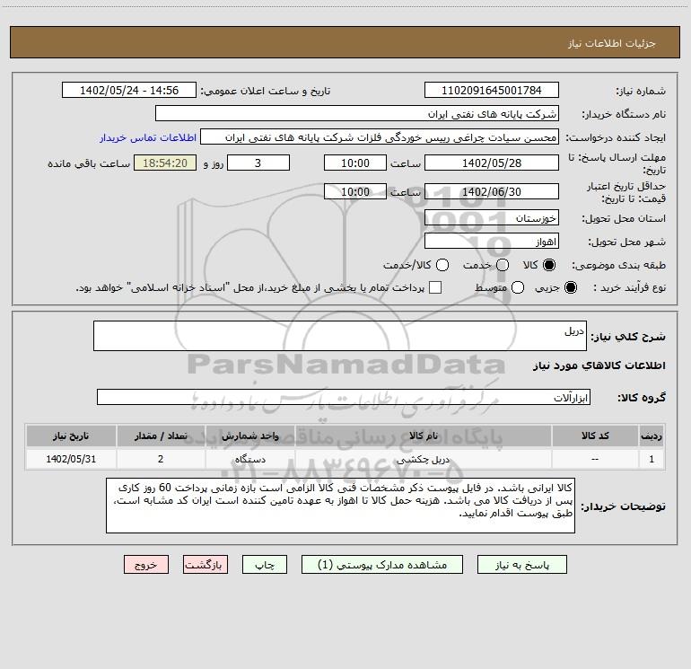 توضیحات خریدار:کالا ایرانی باشد. در فایل پیوست ذکر مشخصات فنی کالا الزامی است بازه زمانی پرداخت 60 روز کاری پس از دریافت کالا می باشد. هزینه حمل کالا تا اهواز به عهده تامین کننده است ایران کد مشابه است، طبق پیوست اقدام نمایید.