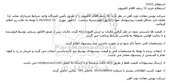شرکت پويش معادن ذوب آهن در نظر دارد 10 رديف اقلام كامپيوتر را از طريق تأمین کنندگان واجد شرايط خريداري نمايد. لذا تقاضا دارد حداقل قيمت پيشنهادي خود را تا روز: چهارشنبه ساعت: 12 ظهر مورخ: 1402.5.25 با توجه به نكات زير اعلام فرمائيد.