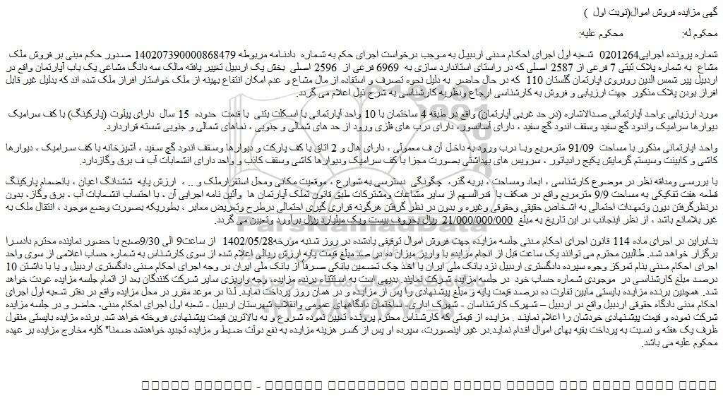 شماره پرونده اجرایی0201264 شعبه اول اجرای احکام مدنی اردبیل به موجب درخواست اجرای حکم به شماره دادنامه مربوطه 140207390000868479 صدور حکم مبنی بر فروش ملک مشاع به شماره پلاک ثبتی 7 فرعی از 2587 اصلی که در راستای استاندارد سازی به 6969 فرعی از 2596 اصلی بخش یک اردبیل تغییر یافته مالک سه دانگ مشاعی یک باب آپارتمان واقع در اردبیل پیر شمس الدین روبروی اپارتمان گلستان 110 که در حال حاضر به دلیل نحوه تصرف و استفاده از مال مشاع و عدم امکان انتفاع بهینه از ملک خواستار افراز ملک شده اند که بدلیل غیر قابل افراز بودن پلاک مذکور جهت ارزیابی و فروش به کارشناسی ارجاع ونظریه کارشناسی به شرح ذیل اعلام می گردد.