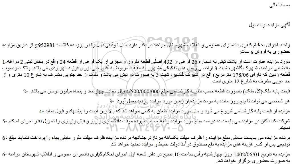 6- مزایده به تاریخ 1402/06/01 روز چهارشنبه رأس ساعت 10 صبح در دفتر شعبه اول اجرای احکام کیفری دادسرای عمومی و انقلاب شهرستان مراغه به صورت حضوری برگزار خواهد شد.